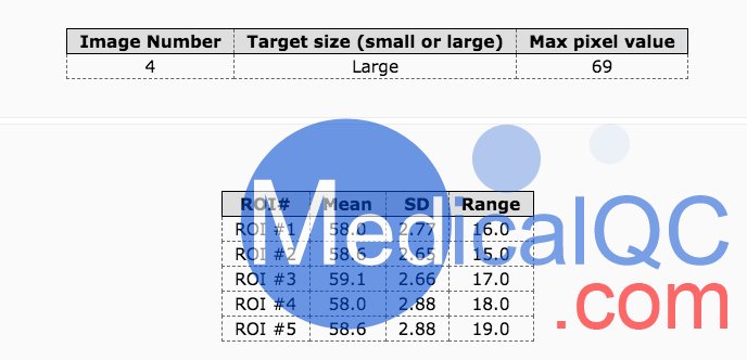 上圖顯示了 5 個(gè)感興趣區(qū)域,下圖是 Smári 報(bào)告。 除此信息外,Smári 報(bào)告還提供了一份基于 Catphan® 700 圖像測(cè)量結(jié)果的綜合報(bào)告。